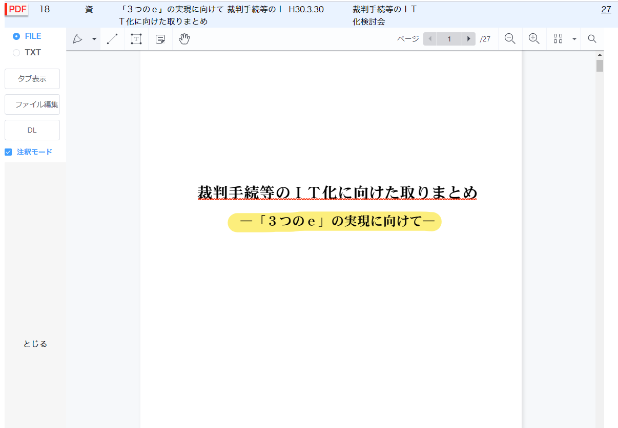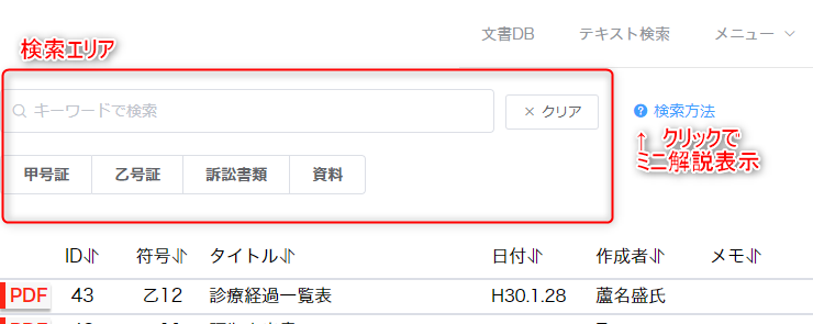 検索ボックスの下に並んでいる文書符号をクリックすると、該当する符号に絞り込まれます。 たとえば「甲」をクリックすると、甲号証だけに絞り込まれます。並び順は、号証の番号順になります。