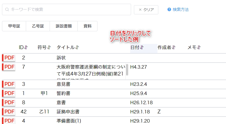 検索結果は並び替えることができます。各項目名をクリックすると昇順・降順が切り替わります。