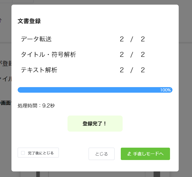 弁護革命サーバーは案件のデータを一切預かりませんが、解析機能を利用した場合も同様です。 解析機能を利用する瞬間だけデータが送信されますが、処理が終わると直ちにデータが削除されます。 下記の「登録完了!」表示が出たときには、既に弁護革命サーバーにデータは残っていません。