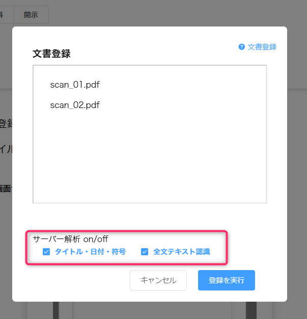 一方をオン、一方をオフにすることもできます。 たとえば「ファイル名を既に正確に付けているが、OCRはできていない」という場合は、「タイトル・日付・符号」はオフ、「全文テキスト認識」はオン、が有効です。