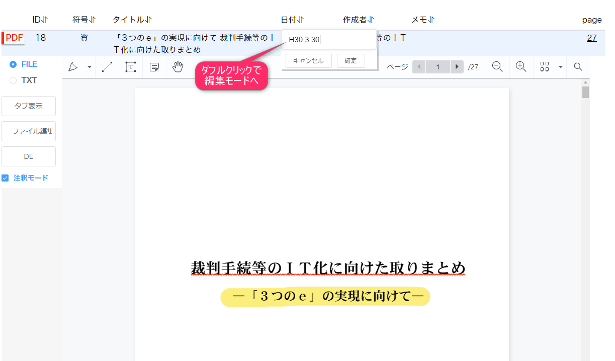 個々の文書のタイトルや日付欄をダブルクリックしてください。 編集モードになります。入力できたらエンターキーを押してください。 memo欄には参考情報を記入できます。 文書レコードを右クリックすると、削除などのメニューも出てきます。