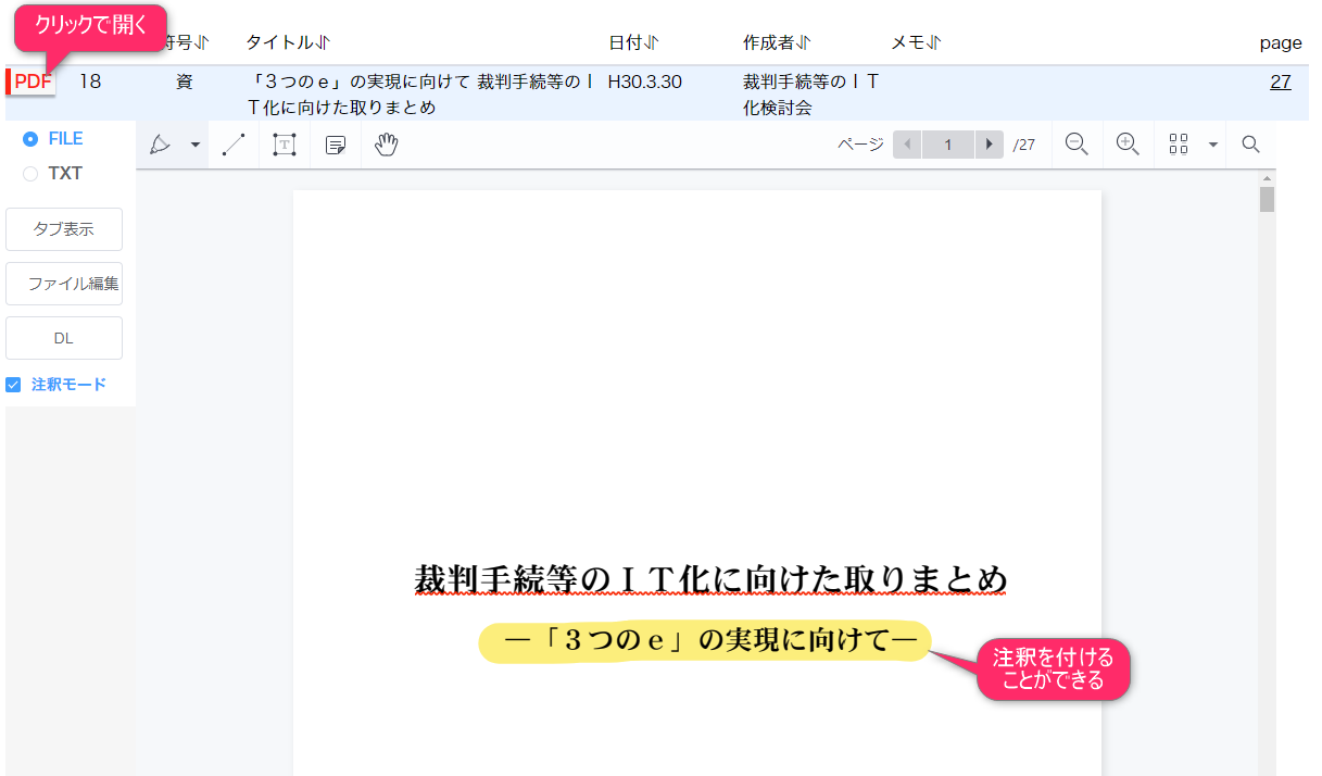 文書登録をすると、左端に「PDF」などのボタンが表示されます。 そのボタンを左クリックで画面内で読めます。右クリックでタブで開くこともでききます。