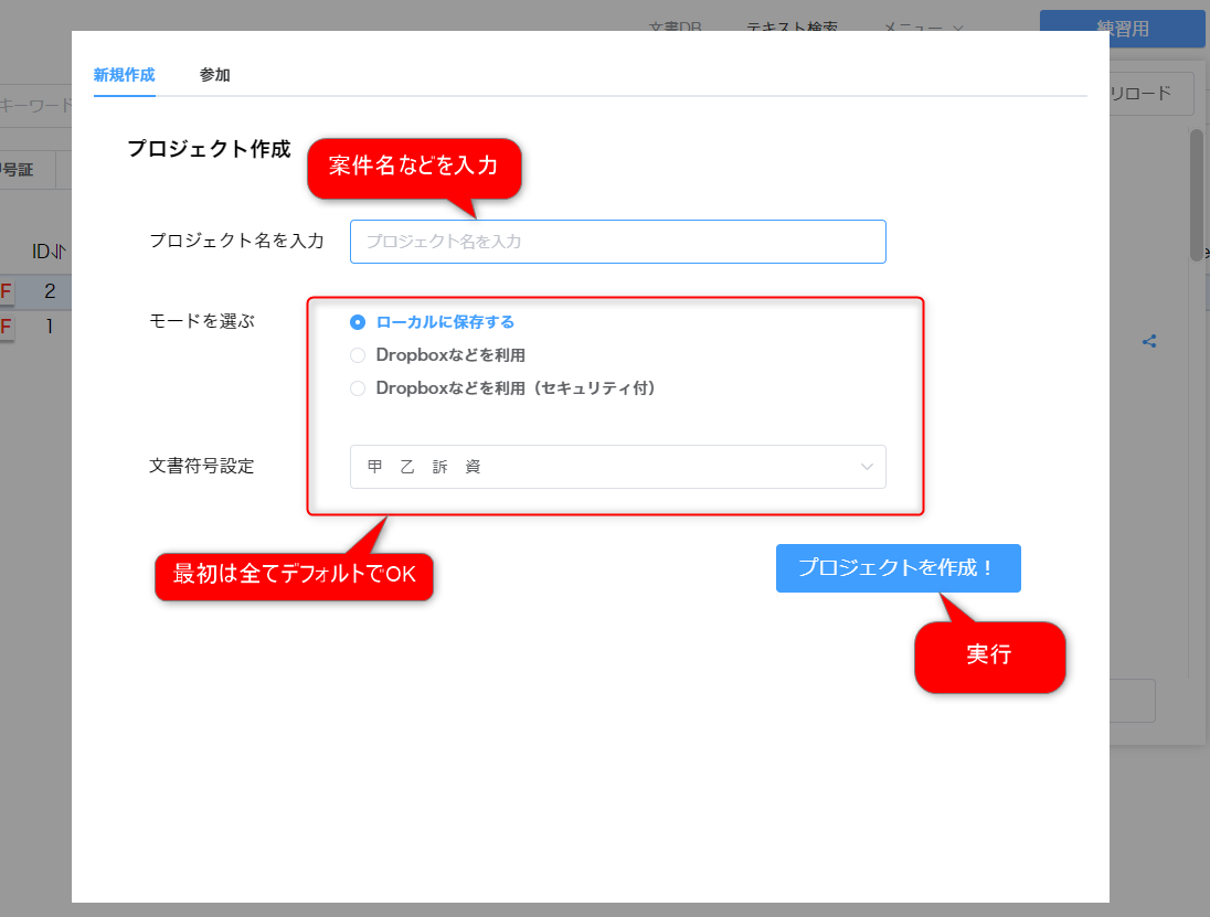 出てきた画面で、プロジェクト名に「サンプル事件」(名前はなんでもOKです)など、適当な名前を入力してください。 あとは全部デフォルトのままで、「OK」をクリックしてください。 すると、文書DB画面に移行します。