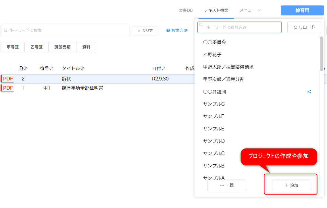 できれば10ファイルくらい入れておいてください。 上部の検索ボックスキーワードを入れるとキーワードで絞り込まれます。 下に並んでいる「甲号証、乙号証」などのボタンをクリックすると、その符号で絞り込まれます。 キーワードと、符号は同時に指定できます。