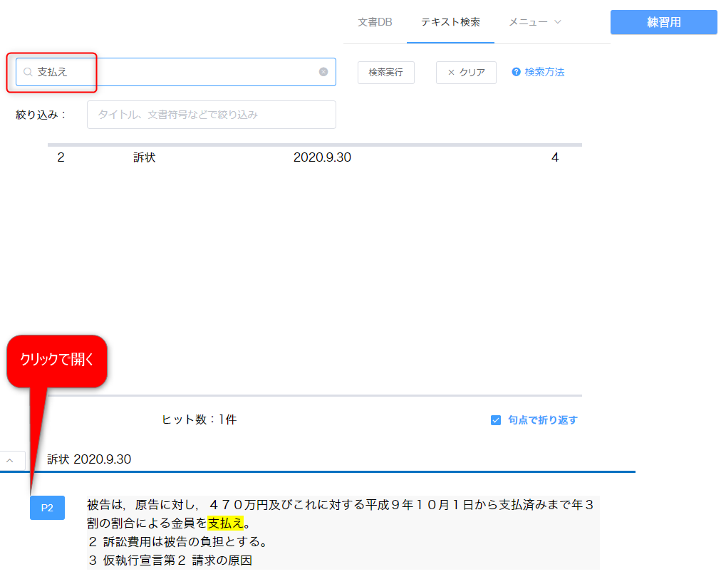 検索ボックスの下に絞り込みというボックスがあります。 ここにキーワードを入れると、タイトルや文書符号での絞り込みをかけられます。 たとえば甲号証だけを全文検索できます。